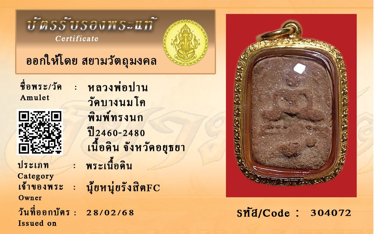 รหัสสินค้า : 304072 หลวงพ่อปาน วัดบางนมโค พิมพ์ทรงนก ปี2460-2480 เนื้อดิน จังหวัดอยุธยา