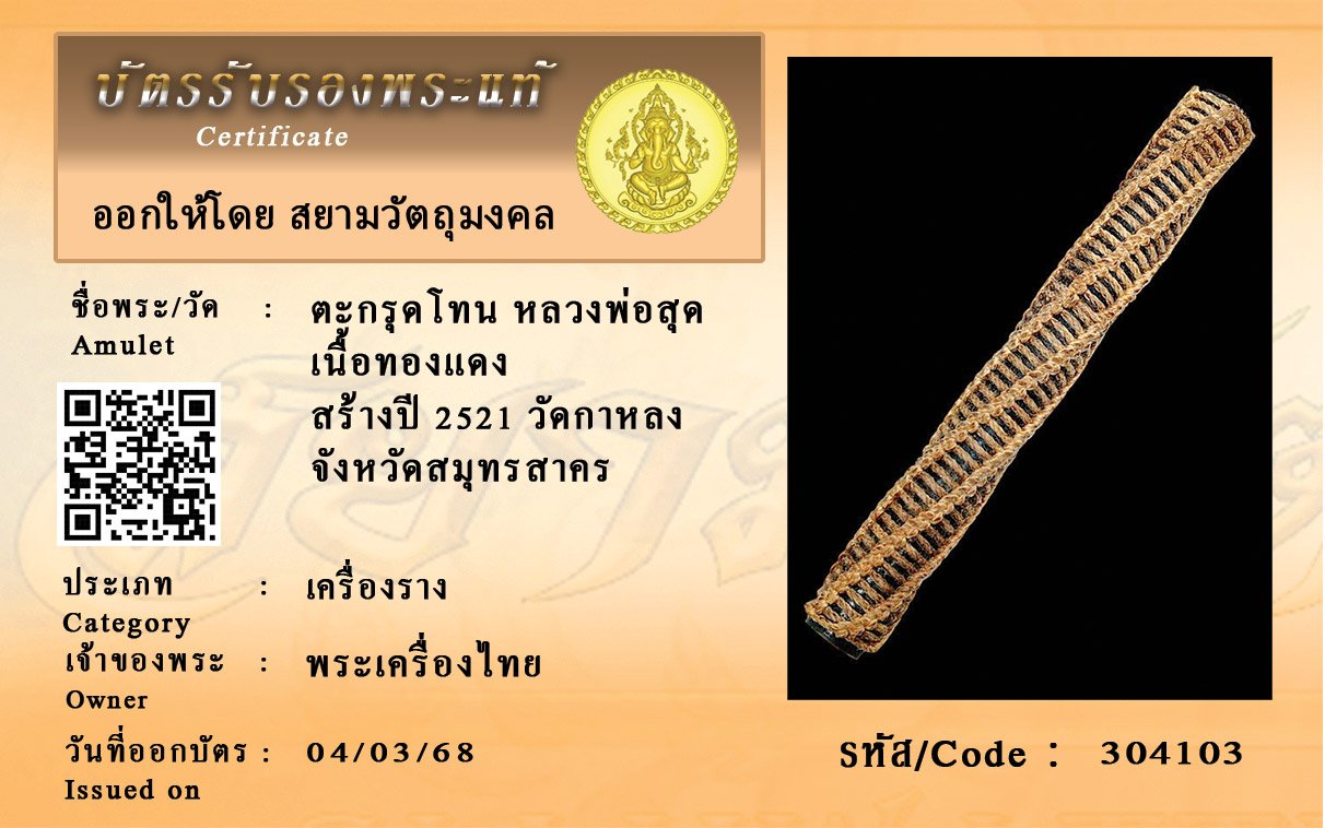 รหัสสินค้า : 304103 ตะกรุดโทน หลวงพ่อสุด เนื้อทองแดง สร้างปี 2521 วัดกาหลง จังหวัดสมุทรสาคร