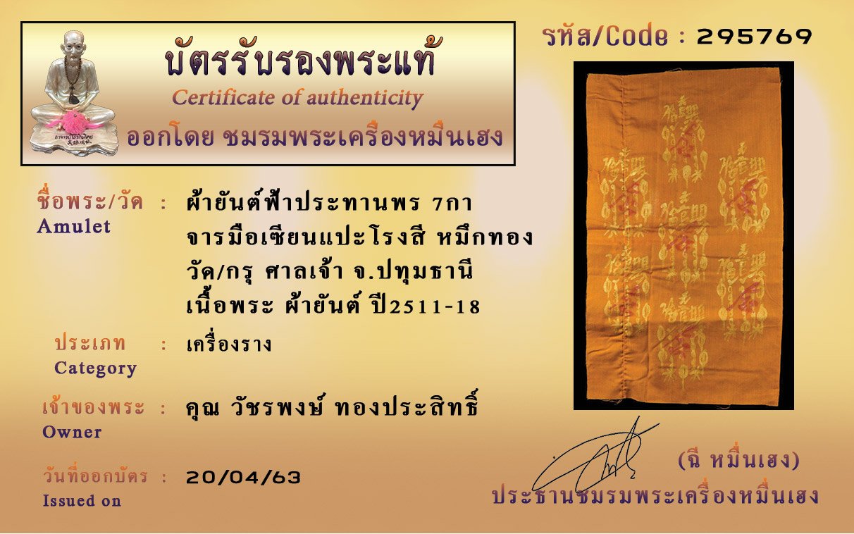 รหัสสินค้า : (295769) ผ้ายันต์ฟ้าประทานพร 7กา จารมือเซียนแปะโรงสี หมึกทอง วัด/กรุ ศาลเจ้า จ.ปทุมธานี เนื้อพระ ผ้ายันต์ ปี2511-18