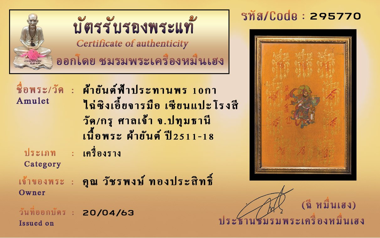 รหัสสินค้า : (295770) ผ้ายันต์ฟ้าประทานพร 10กา ไฉ่ซิงเอี้ยจารมือ เซียนแปะโรงสี วัด/กรุ ศาลเจ้า จ.ปทุมธานี เนื้อพระ ผ้ายันต์ ปี2511-18