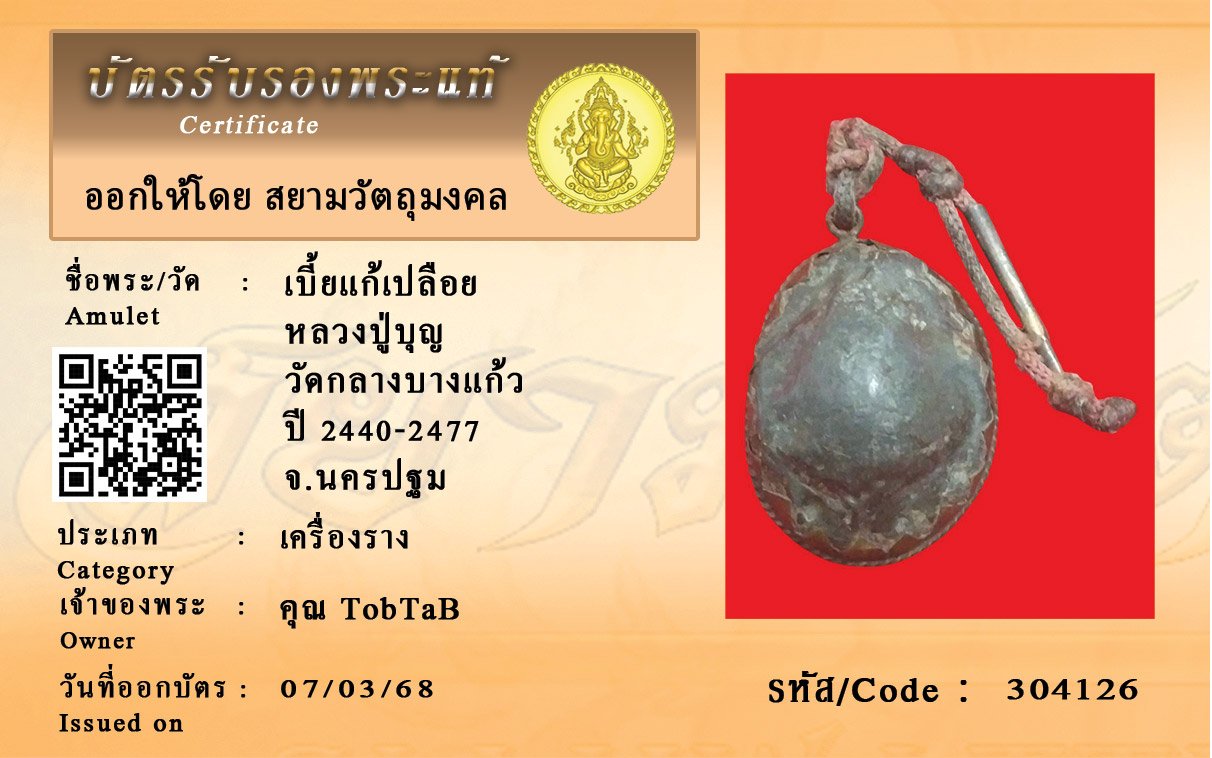 รหัสสินค้า : 304126 เบี้ยแก้เปลือย หลวงปู่บุญ วัดกลางบางแก้ว ปี 2440-2477 จ.นครปฐม