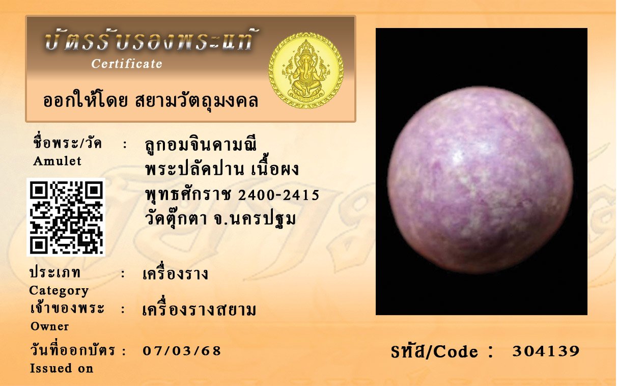 รหัสสินค้า : 304139 ลูกอมจินดามณี พระปลัดปาน เนื้อผง พุทธศักราช 2400-2415 วัดตุ๊กตา จ.นครปฐม