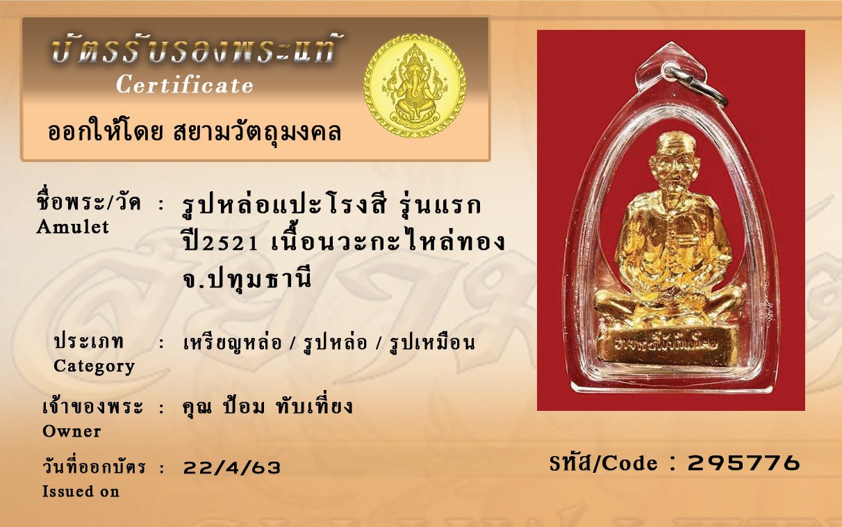 รหัสสินค้า : (295776) รูปหล่อแปะโรงสี รุ่นแรกปี2521 เนื้อนวะกะไหล่ทอง จ.ปทุมธานี