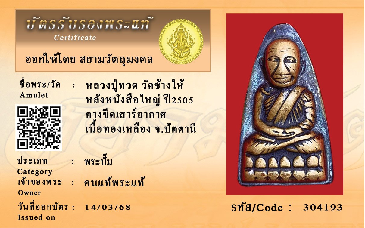 รหัสสินค้า : 304193 หลวงปู่ทวด วัดช้างให้ หลังหนังสือใหญ่ ปี2505 คางขีดเสาร์อากาศ เนื้อทองเหลือง จ.ปัตตานี