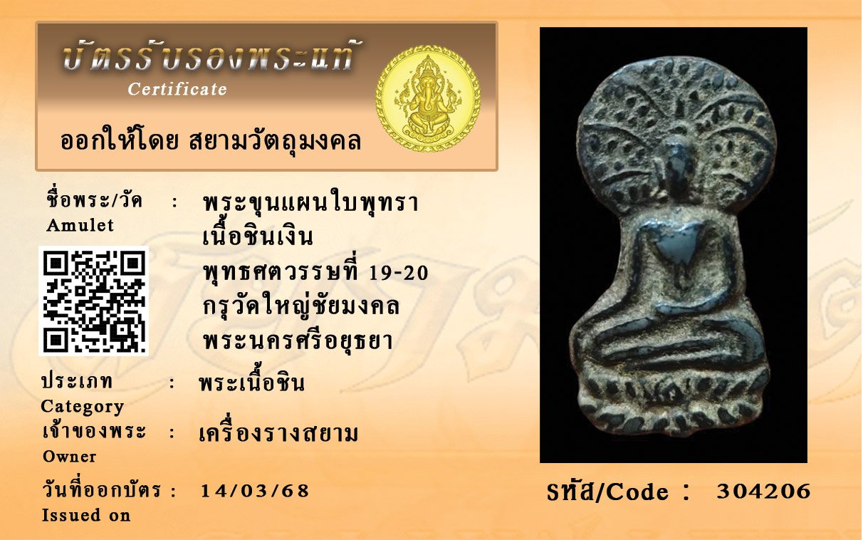 รหัสสินค้า : 304206 พระขุนแผนใบพุทรา เนื้อชินเงิน พุทธศตวรรษที่ 19-20 กรุวัดใหญ่ชัยมงคล พระนครศรีอยุธยา