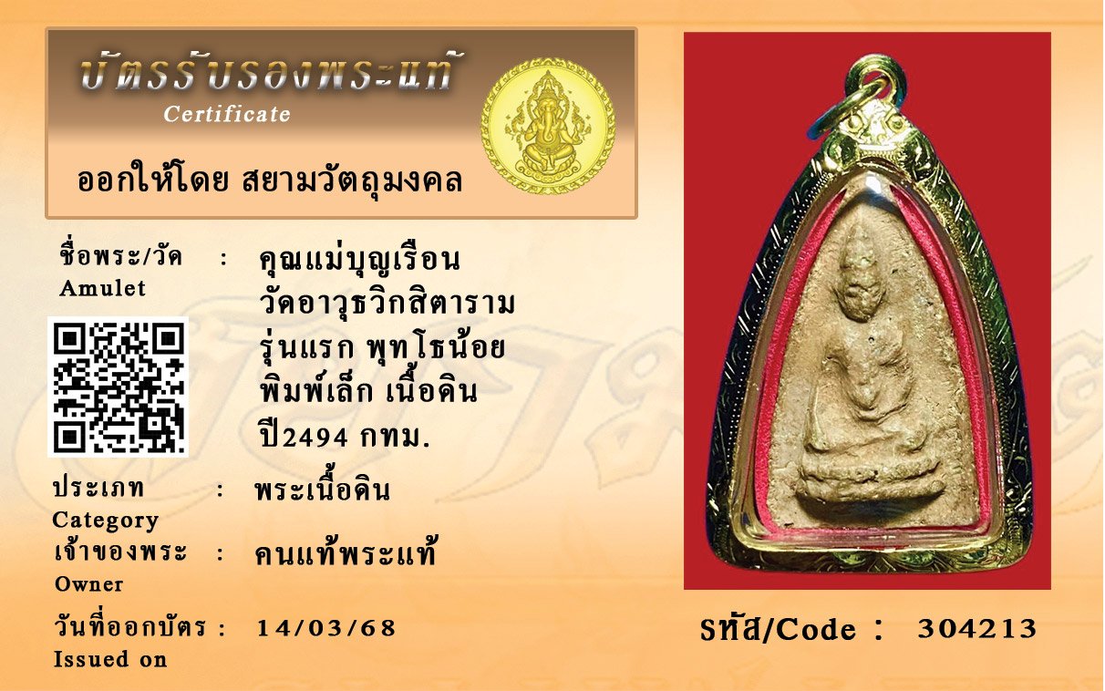 รหัสสินค้า : 304213 คุณแม่บุญเรือน วัดอาวุธวิกสิตาราม รุ่นแรก พุทโธน้อย พิมพ์เล็ก เนื้อดิน ปี2494 กทม.