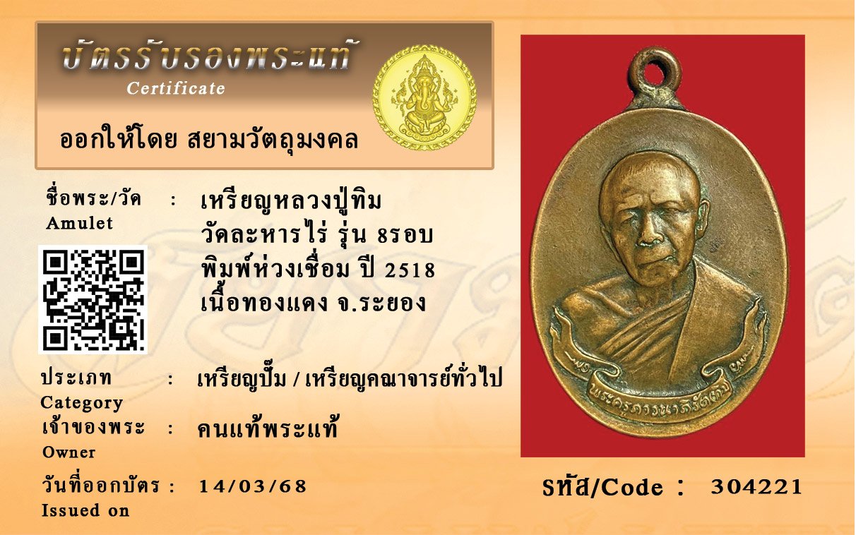 รหัสสินค้า : 304221 เหรียญหลวงปู่ทิม วัดละหารไร่ รุ่น 8รอบ พิมพ์ห่วงเชื่อม ปี 2518 เนื้อทองแดง จ.ระยอง