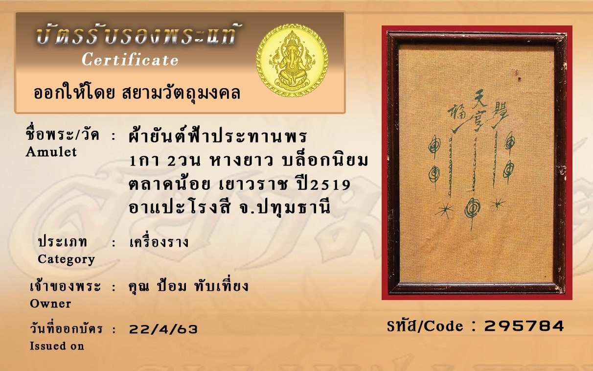 รหัสสินค้า : (295784) ผ้ายันต์ฟ้าประทานพร1กา 2วน หางยาว บล็อกนิยม ตลาดน้อย เยาวราช ปี2519 อาแปะโรงสี จ.ปทุมธานี
