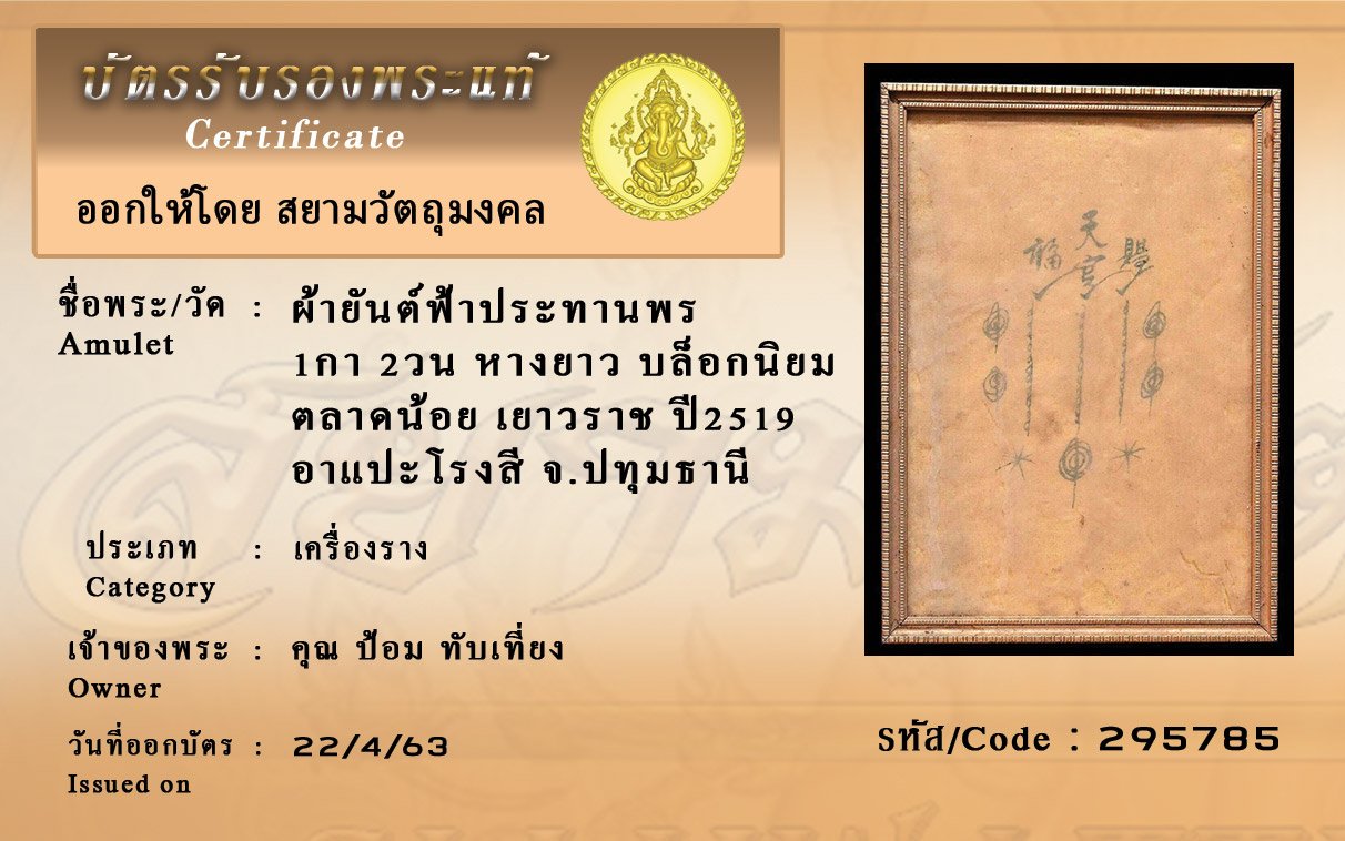 รหัสสินค้า : (295785) ผ้ายันต์ฟ้าประทานพร1กา 2วน หางยาว บล็อกนิยม ตลาดน้อย เยาวราช ปี2519 อาแปะโรงสี จ.ปทุมธานี