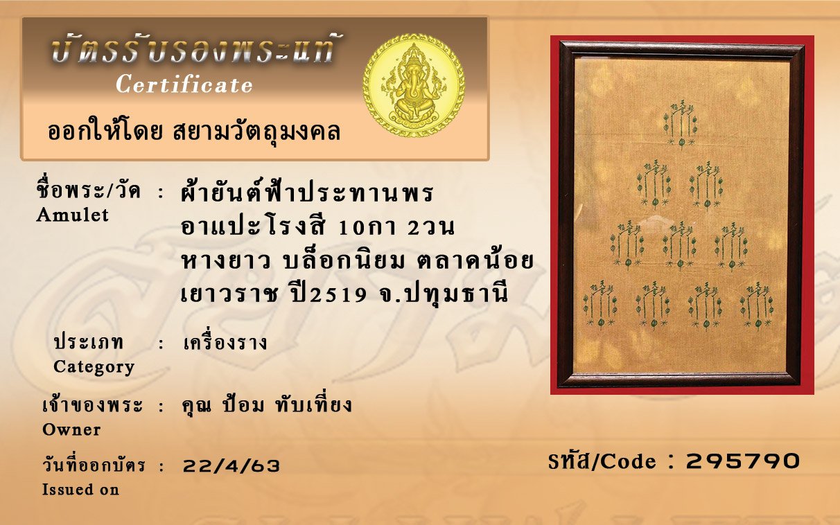 รหัสสินค้า : (295790) ผ้ายันต์ฟ้าประทานพร อาแปะโรงสี 1กา 2วน หางยาว บล็อกนิยม ตลาดน้อย เยาวราช ปี2519 จ.ปทุมธานี