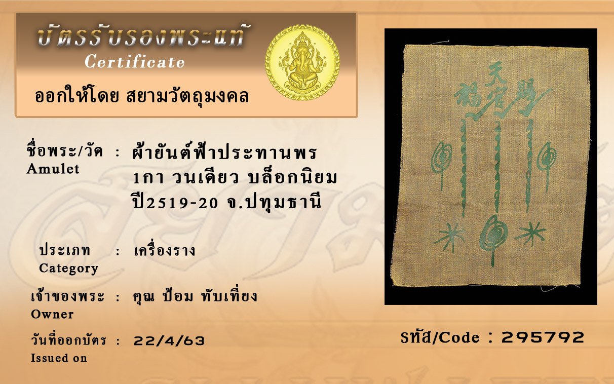 รหัสสินค้า : (295792) ผ้ายันต์ฟ้าประทานพร 1กา วนเดียว บล็อกนิยมปี2519-20 จ.ปทุมธานี