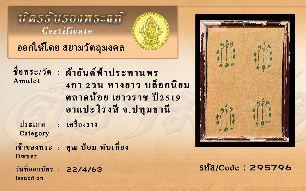 รหัสสินค้า : (295796) ผ้ายันต์ฟ้าประทานพร4กา 2วน หางยาว บล็อกนิยม ตลาดน้อย เยาวราช ปี2519 อาแปะโรงสี จ.ปทุมธาน