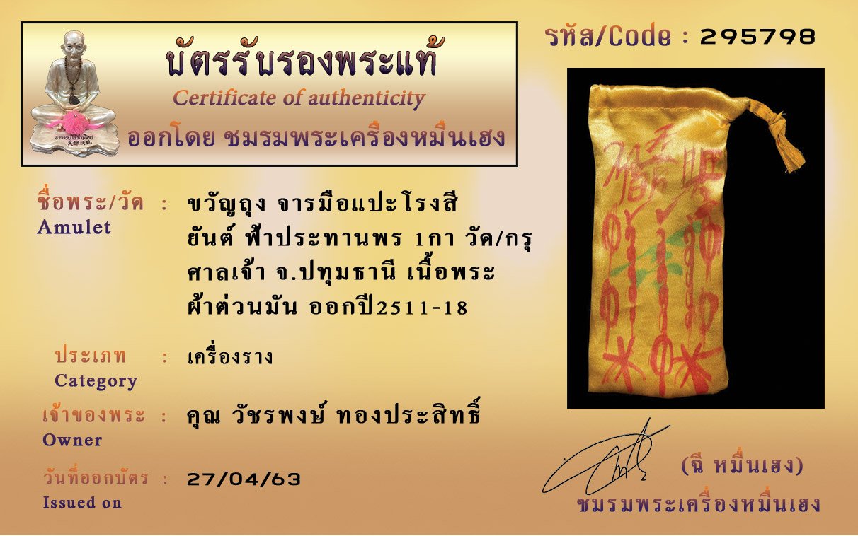 รหัสสินค้า : (295798) ขวัญถุง จารมือแปะโรงสี ยันต์ ฟ้าประทานพร 1กา วัด/กรุ ศาลเจ้า จ.ปทุมธานี เนื้อพระ ผ้าต่วนมัน ออกปี2511-18