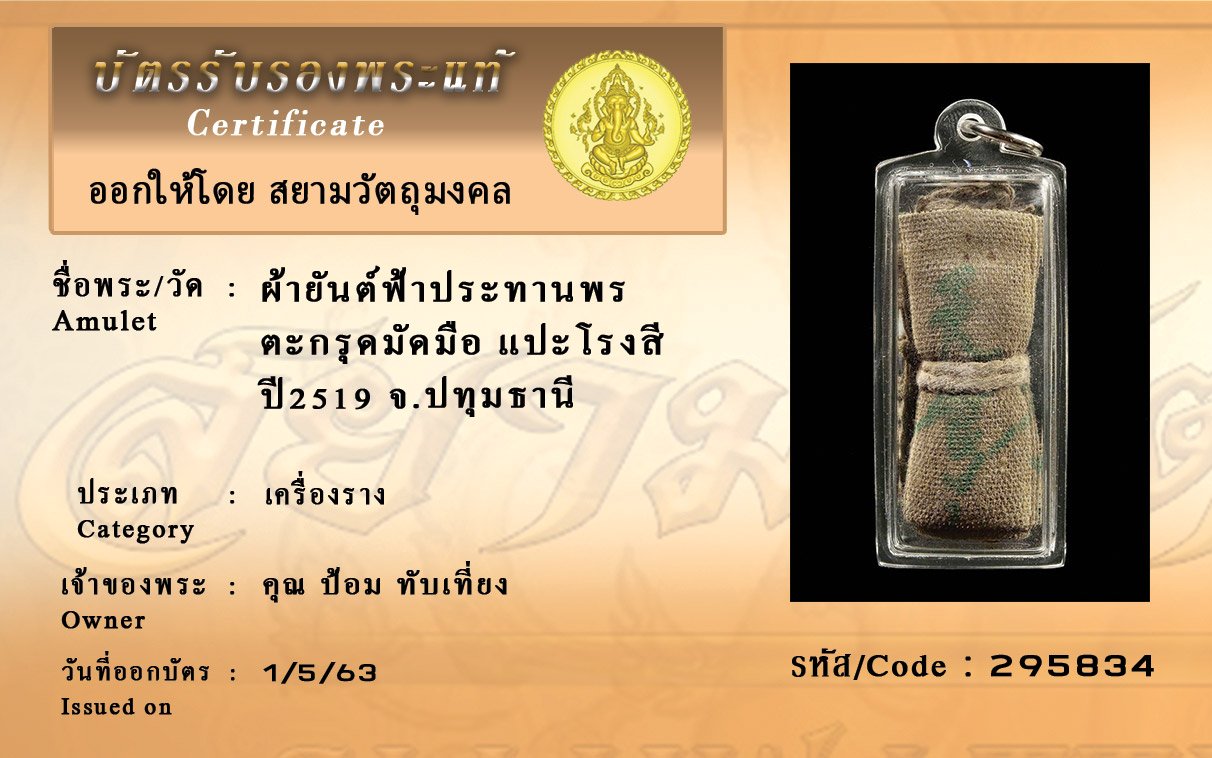 รหัสสินค้า : (295834) ผ้ายันต์ฟ้าประทานพร ตะกรุดมัดมือ แปะโรงสี ปี2519 จังหวัดปทุมธานี
