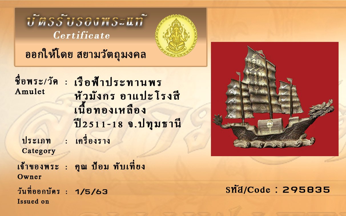 รหัสสินค้า : (295835) เรือฟ้าประทานพรหัวมังกร อาแปะโรงสี เนื้อทองเหลือง ปี2511-18 จังหวัดปทุมธานี