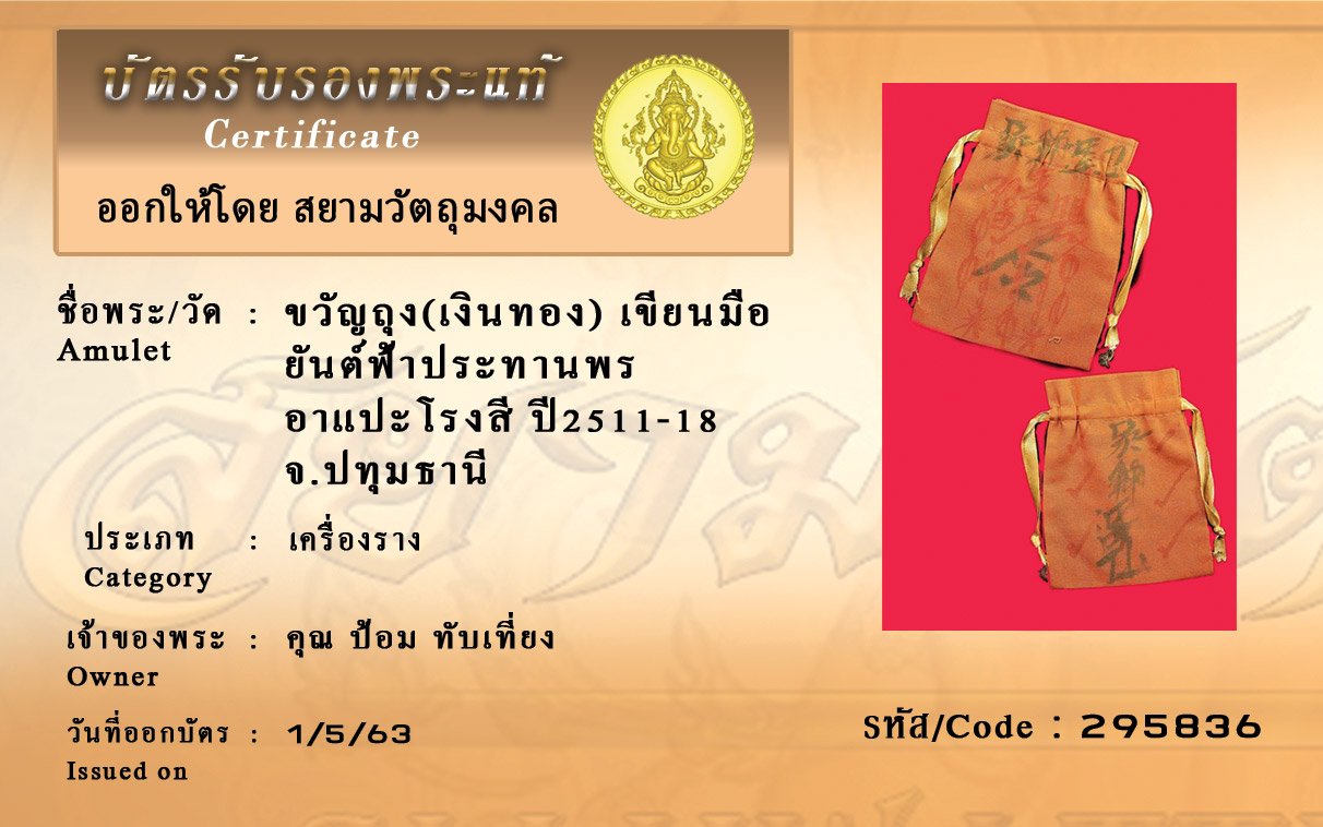 รหัสสินค้า : (295836) ขวัญถุง(เงินทอง) เขียนมือ ยันต์ฟ้าประทานพร อาแปะโรงสี ปี2511-18 จังหวัดปทุมธานี ชื่อ ป้อม ทับเที่ยง
