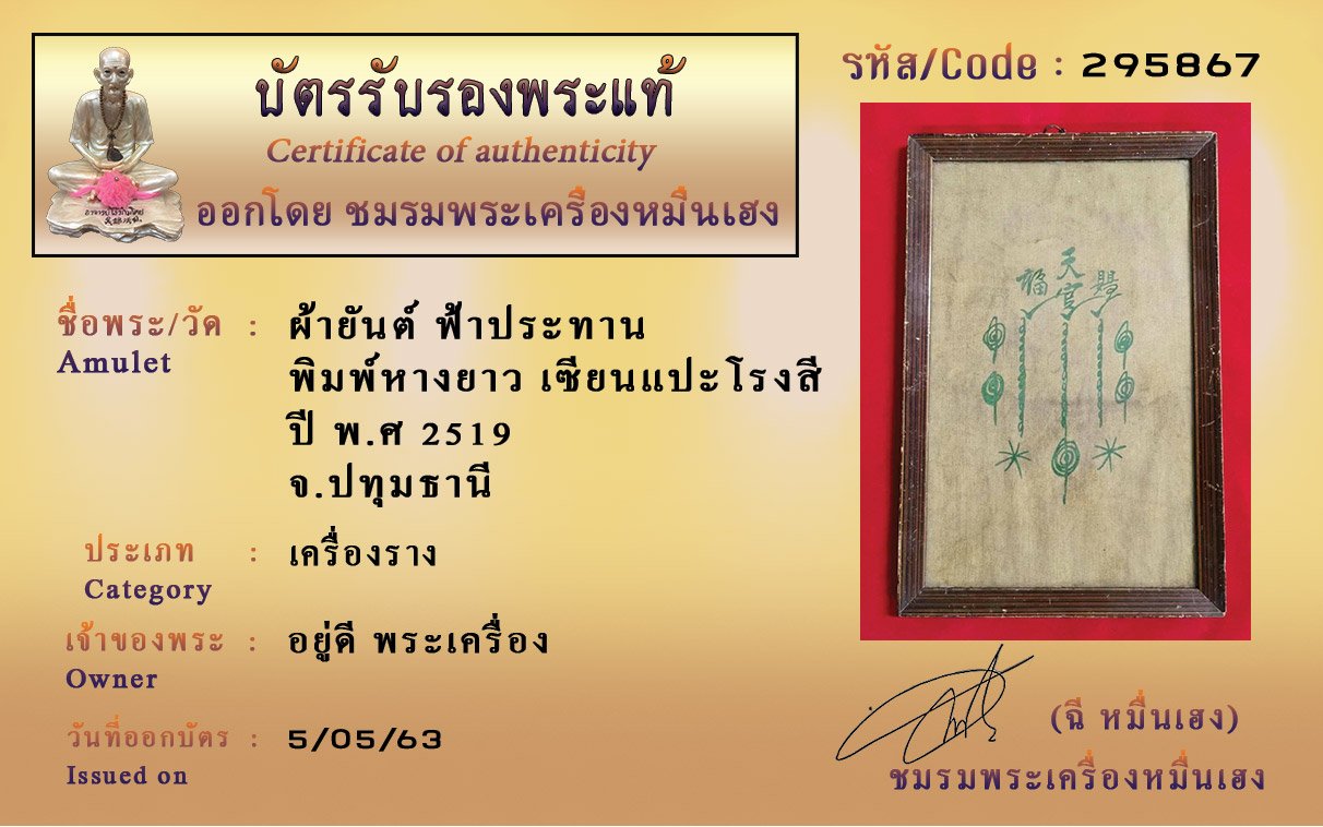 รหัสสินค้า : (295867) ผ้ายันต์ ฟ้าประทาน พิมพ์หางยาว เซียนแปะโรงสี ปี พ.ศ 2519 จังหวัดปทุมธานี