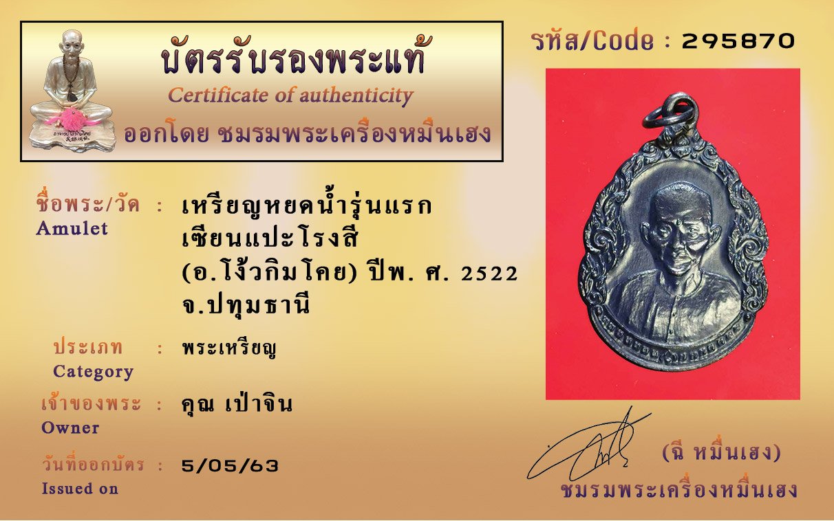 รหัสสินค้า : (295870) เหรียญหยดน้ำรุ่นแรก เซียนแปะโรงสี (อ.โง้วกิมโคย) ปีพ. ศ. 2522 จังหวัดปทุมธานี