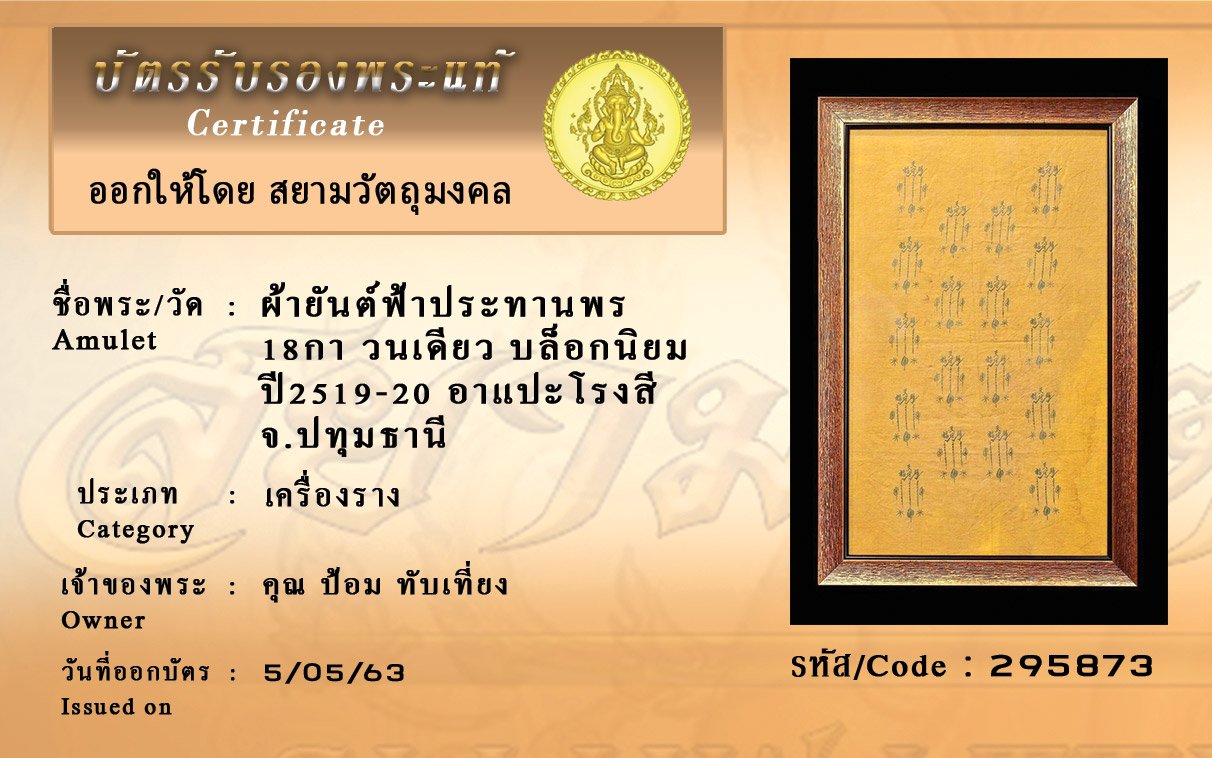 รหัสสินค้า : (295873) ผ้ายันต์ฟ้าประทานพร18กา วนเดียว บล็อกนิยม ปี2519-20อาแปะโรงสี จังหวัดปทุมธานี