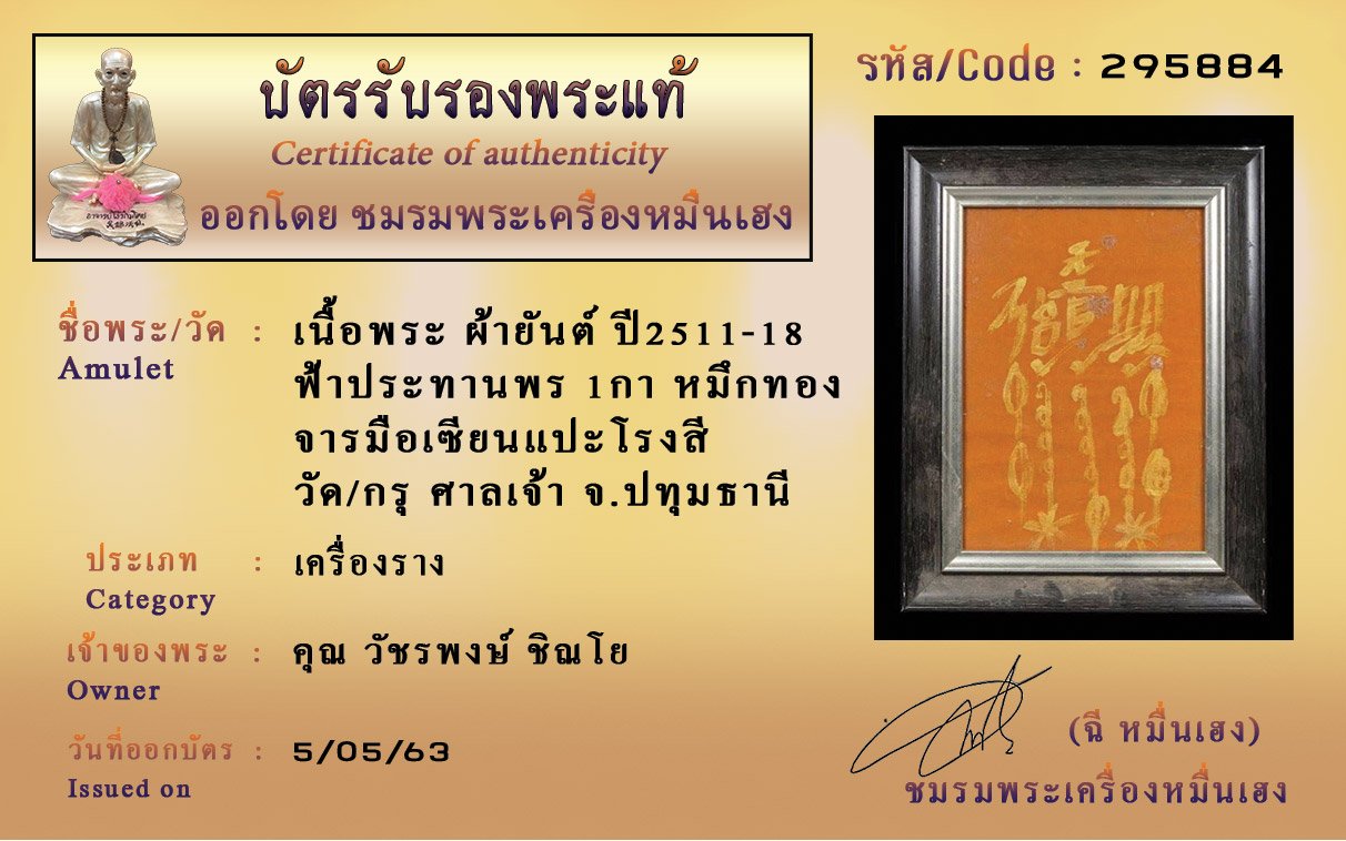 รหัสสินค้า : (295884) เนื้อพระ ผ้ายันต์ ปี2511-18 ฟ้าประทานพร 1กา หมึกทอง จารมือเซียนแปะโรงสี วัด/กรุ ศาลเจ้า จ.ปทุมธานี