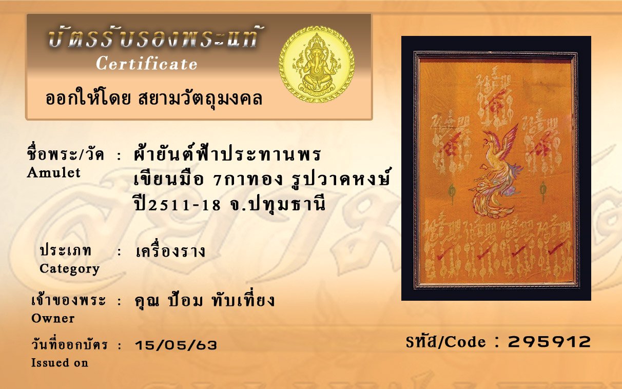 รหัสสินค้า : (295912) ผ้ายันต์ฟ้าประทานพร เขียนมือ7กา ทอง รูปวาด หงษ์ ปี11-18 จ.ปทุมธานี