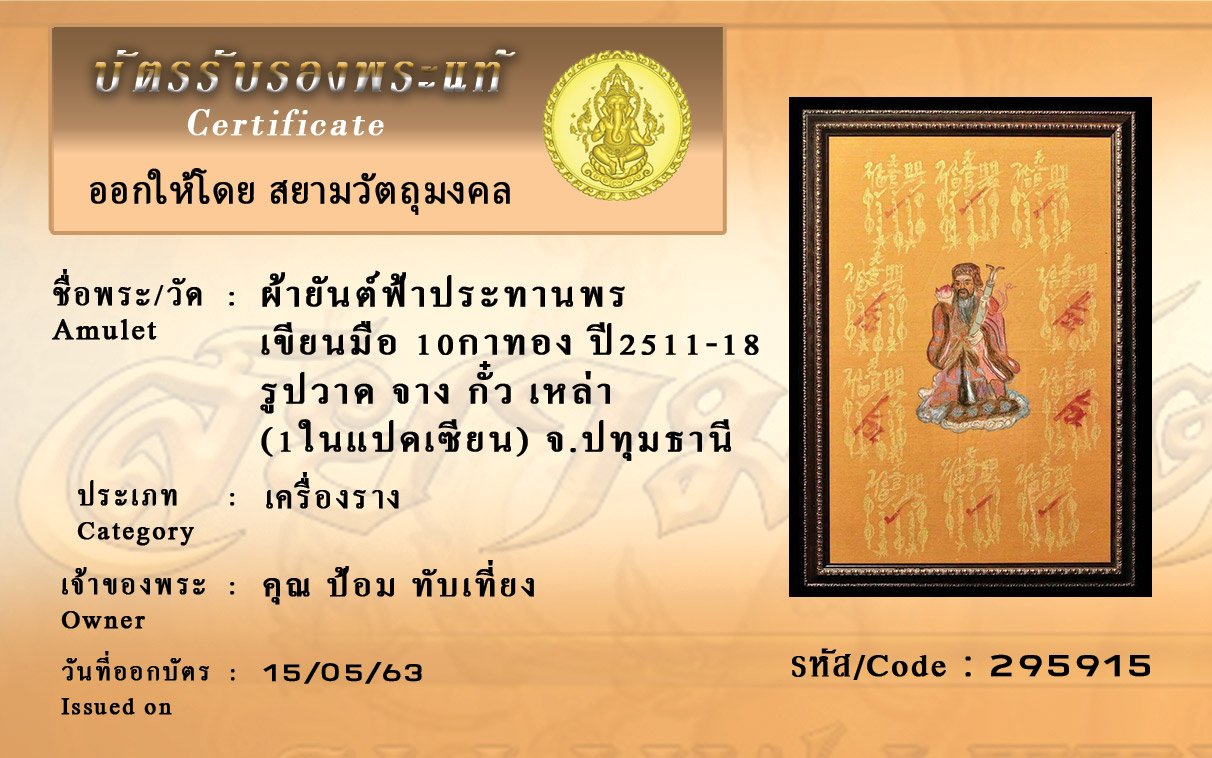 รหัสสินค้า : (295915) ผ้ายันต์ฟ้าประทานพร เขียนมือ10กา ทอง รูปวาด จาง กั๋ว เหล่า (1ในแปดเซียน ปี11-18 จ.ปทุมธานี