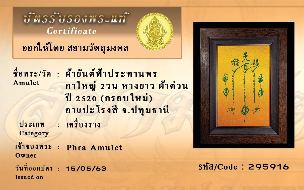รหัสสินค้า : (295916) ผ้ายันต์ฟ้าประทานพร กาใหญ่ 2วน หางยาว ผ้าต่วน ปี 20 ( กรอบใหม่ ) อาแปะโรงสี จ.ปทุมธานี