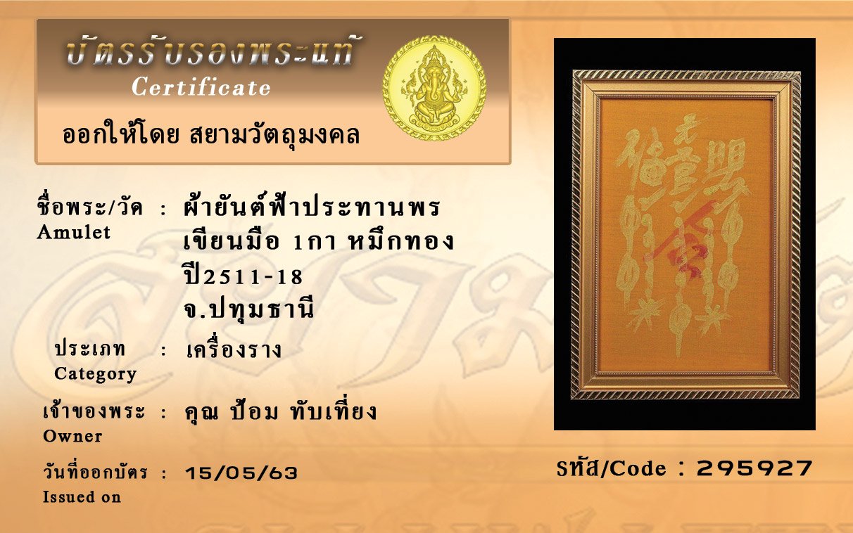 รหัสสินค้า : (295927) ผ้ายันต์ฟ้าประทานพร เขียนมือ 1กา แปะโรงสี หมึกทอง ปี2511-18 จ.ปทุมธานี