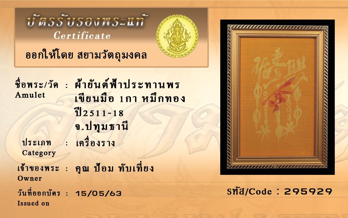 รหัสสินค้า : (295929) ผ้ายันต์ฟ้าประทานพร เขียนมือ 1กา แปะโรงสี หมึกทอง ปี2511-18 จ.ปทุมธานี