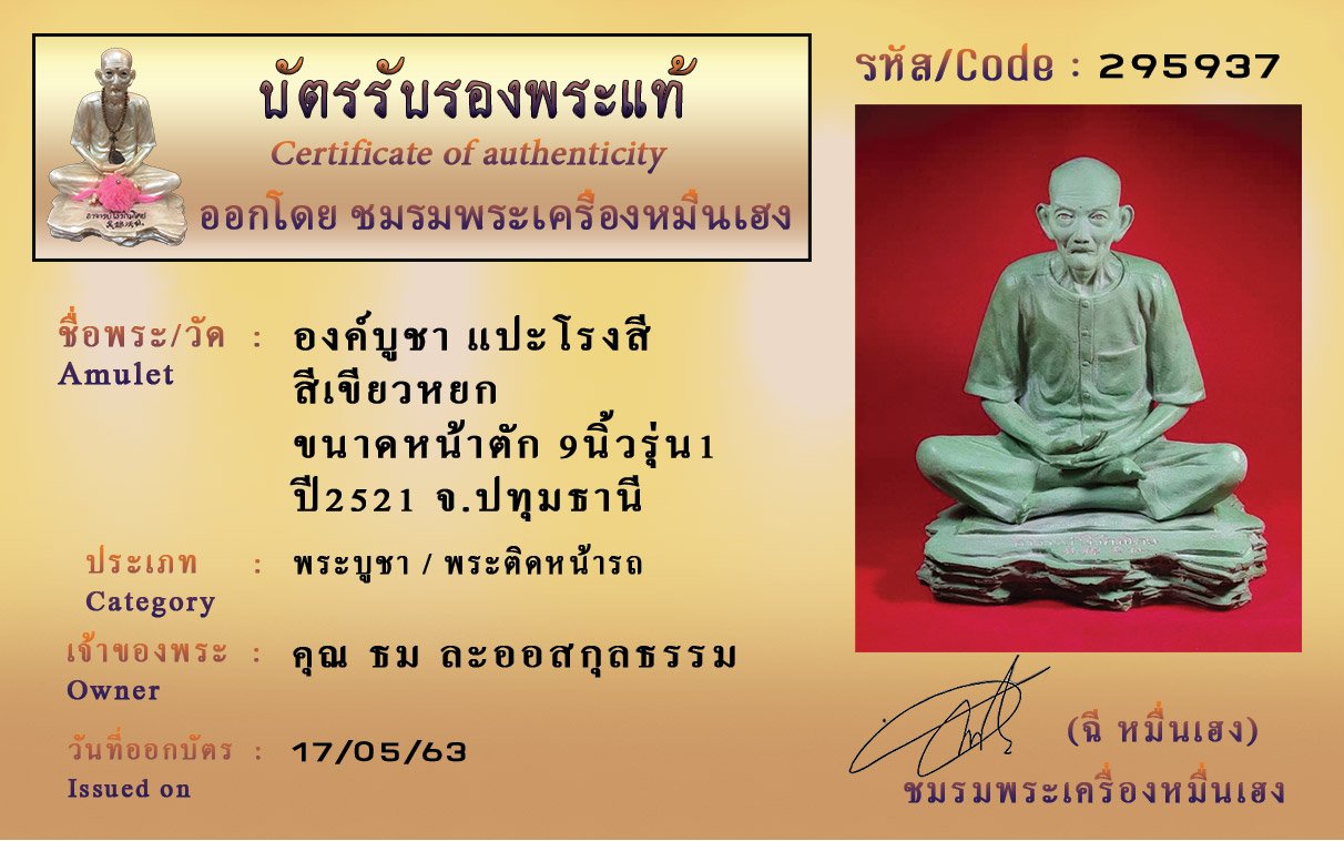 รหัสสินค้า : (295937) องค์บูชา แปะโรงสี สีเขียวหยก ขนาดหน้าตัก 9นิ้ว รุ่น1 ปี2521 จ.ปทุมธานี