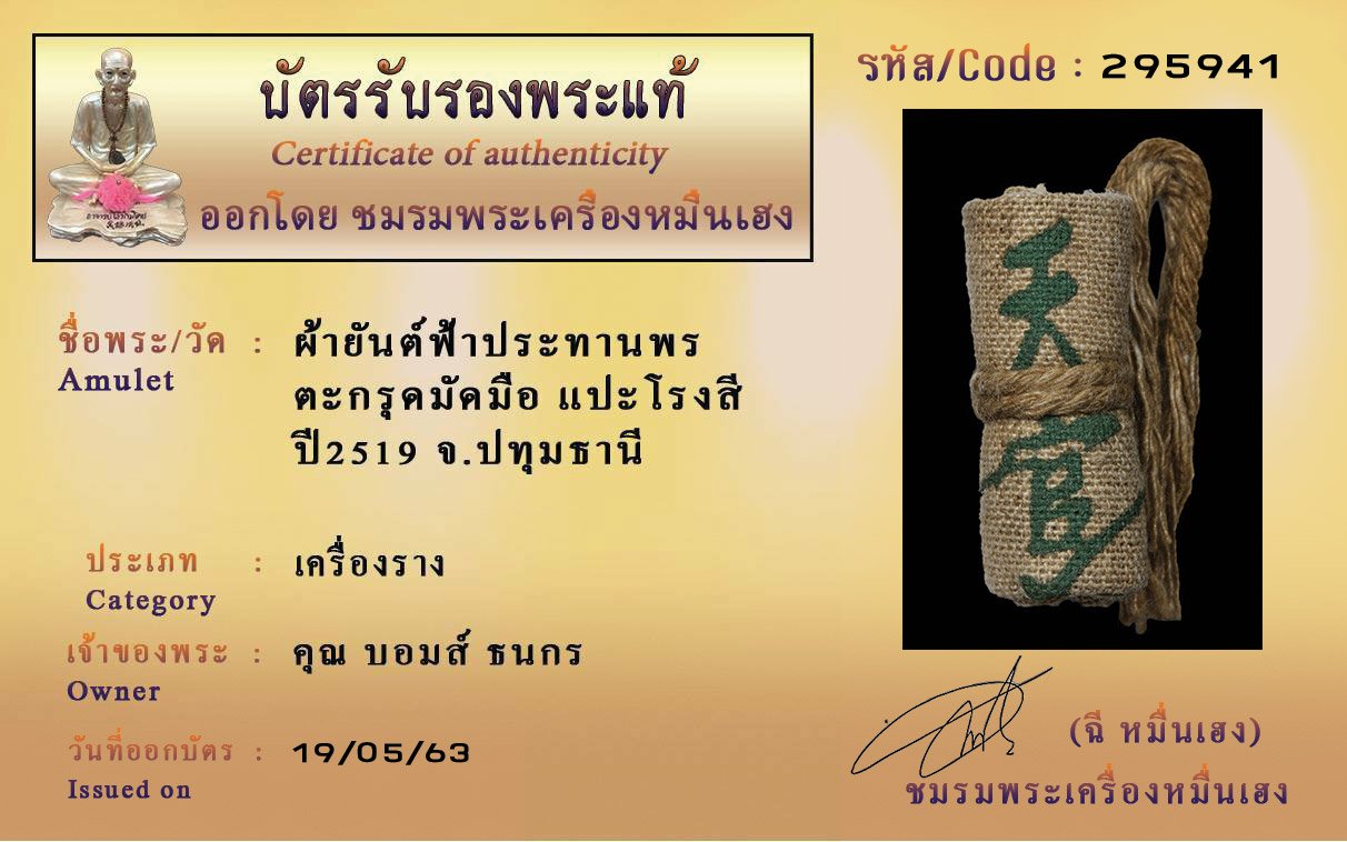 รหัสสินค้า : (295941) ผ้ายันต์ฟ้าประทานพร ตระกรุดมัดมือ แปะโรงสี ปี2519 จ.ปทุมธานี