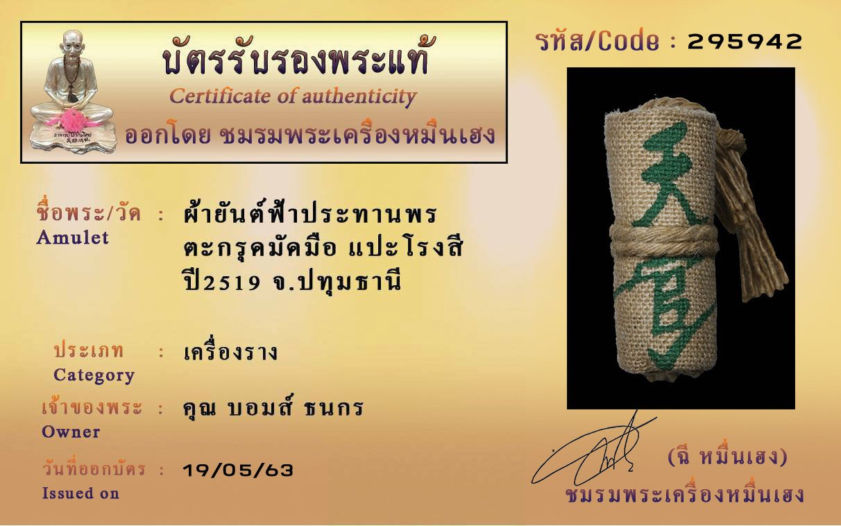 รหัสสินค้า : (295942) ผ้ายันต์ฟ้าประทานพร ตระกรุดมัดมือ แปะโรงสี ปี2519 จ.ปทุมธานี