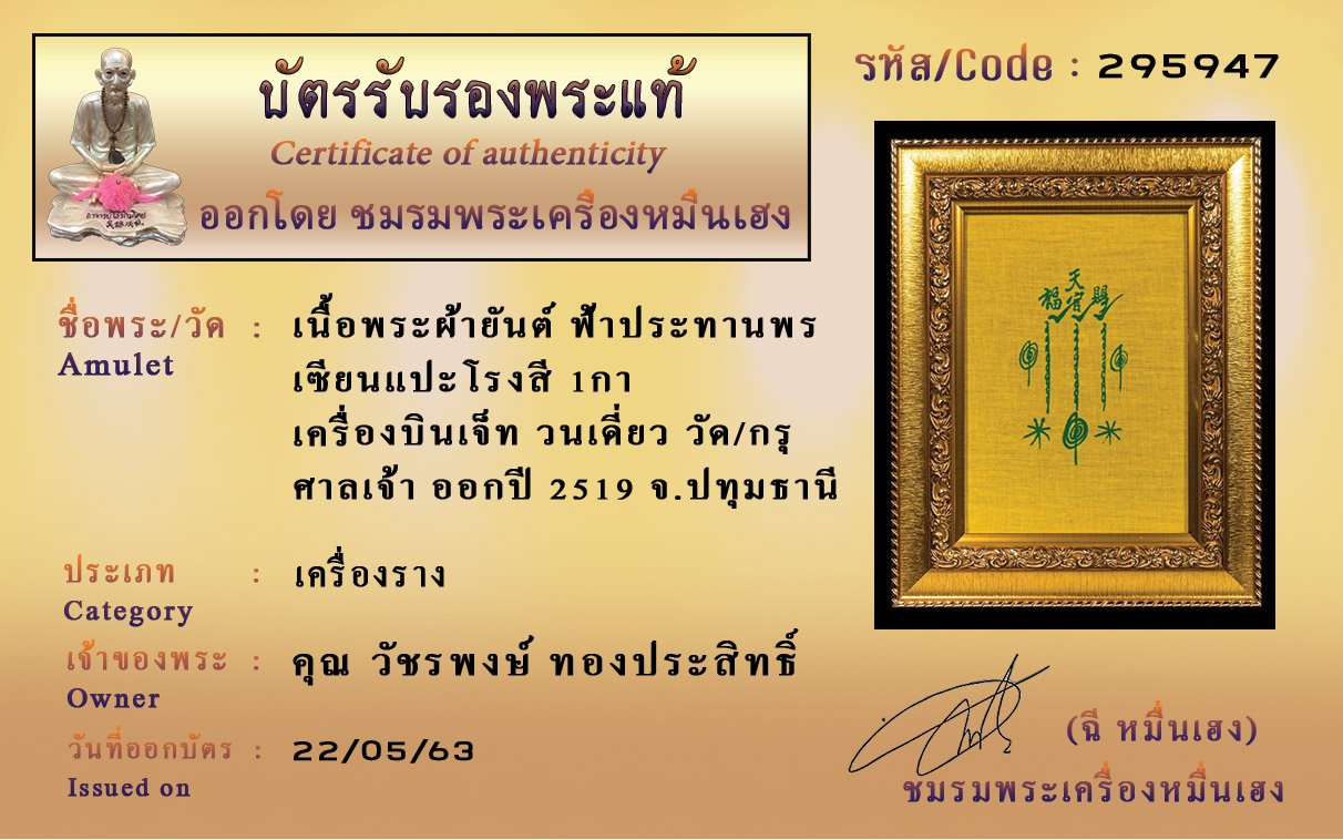 รหัสสินค้า : (295947) ผ้ายันต์ ฟ้าประทานพรเซียนแปะโรงสี 1กา เครื่องบินเจ็ท วนเดี่ยว วัด/กรุ ศาลเจ้า จ.ปทุมธานี เนื้อพระ ผ้ายันต์ ออกปี2519