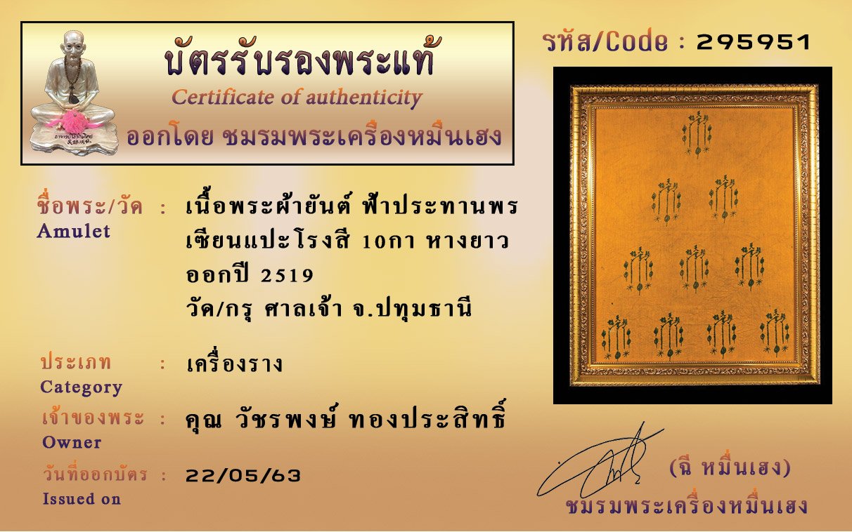 รหัสสินค้า : (295951) ผ้ายันต์ฟ้าประทานพร 10กา เซียนแปะโรงสี หางยาว วัด/กรุ ศาลเจ้า จ.ปทุมธานี เนื้อพระ ผ้ายันต์ ออกปี2519