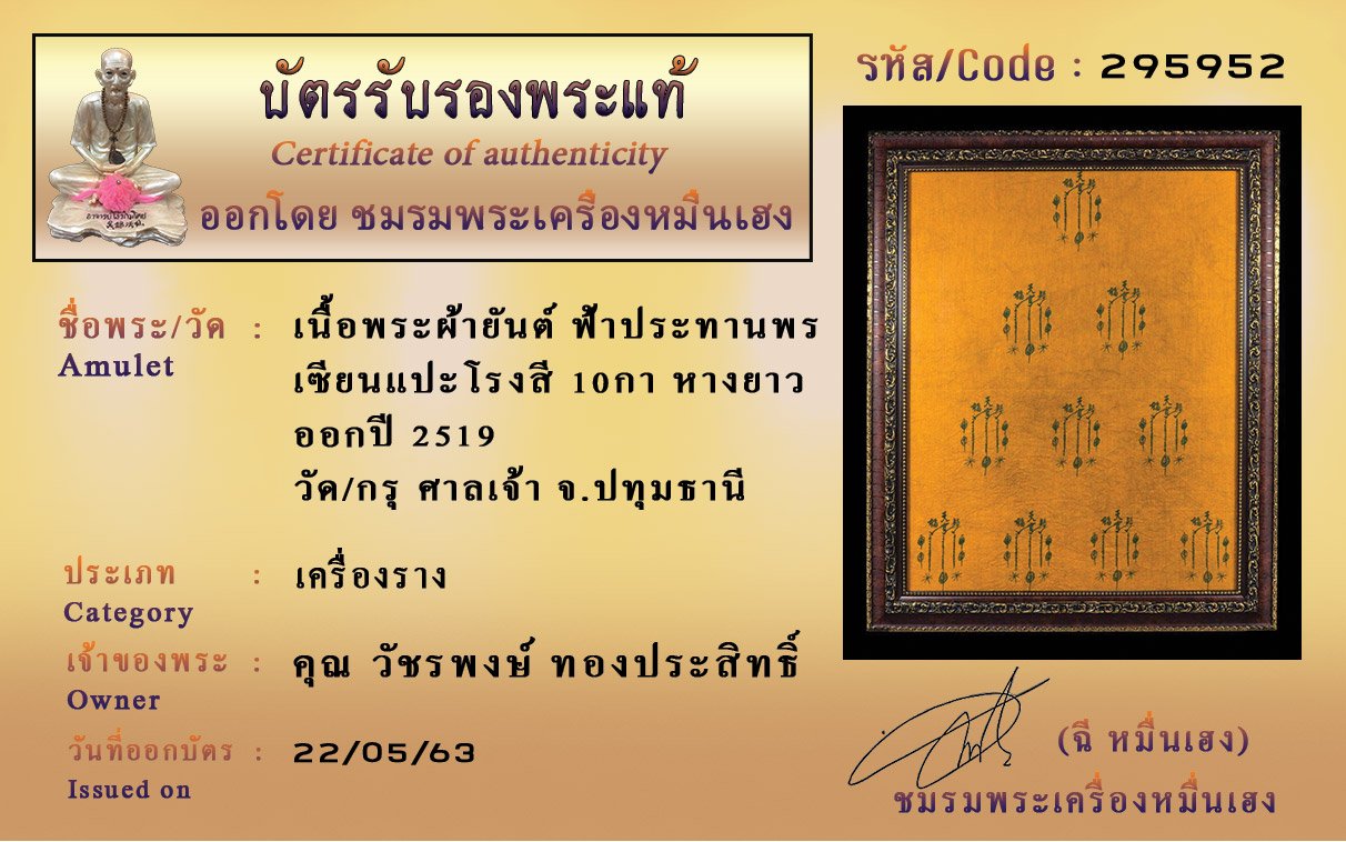 รหัสสินค้า : (295952) ผ้ายันต์ฟ้าประทานพร 10กา เซียนแปะโรงสี หางยาว วัด/กรุ ศาลเจ้า จ.ปทุมธานี เนื้อพระ ผ้ายันต์ ออกปี2519