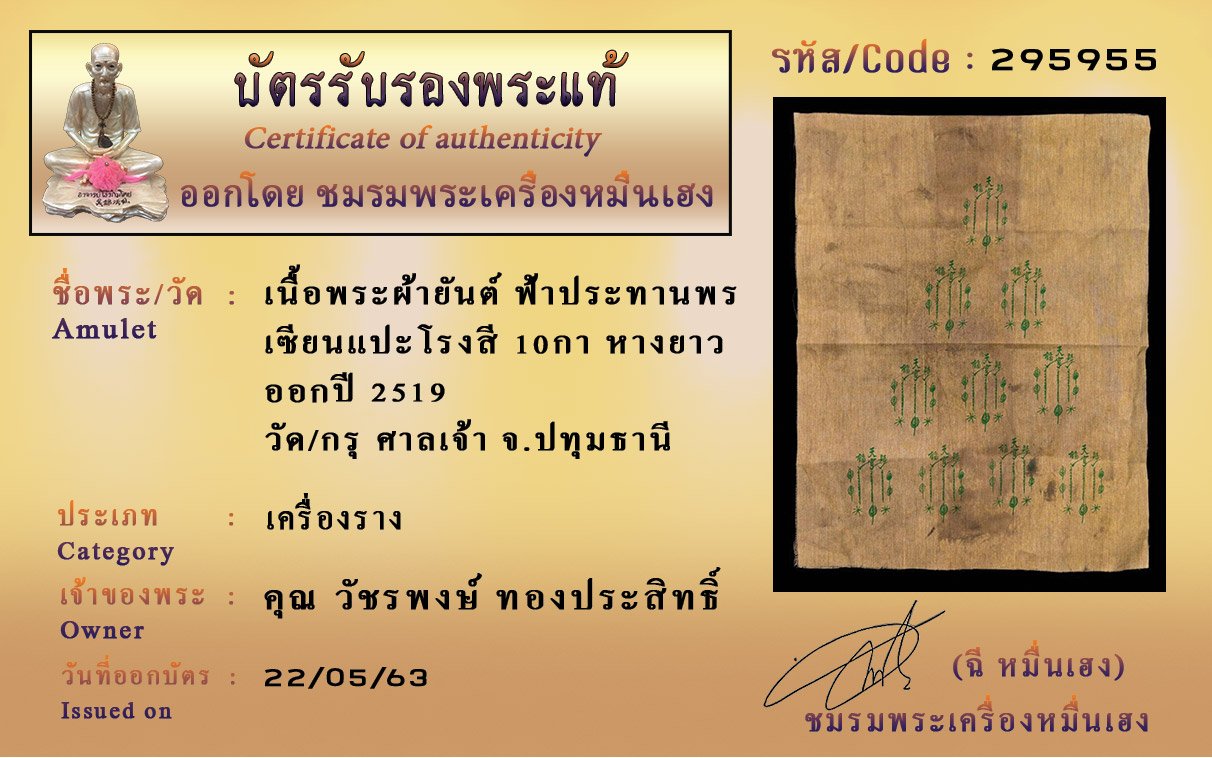 รหัสสินค้า : (295955) ผ้ายันต์ฟ้าประทานพร 10กา เซียนแปะโรงสี หางยาว วัด/กรุ ศาลเจ้า จ.ปทุมธานี เนื้อพระ ผ้ายันต์ ออกปี2519