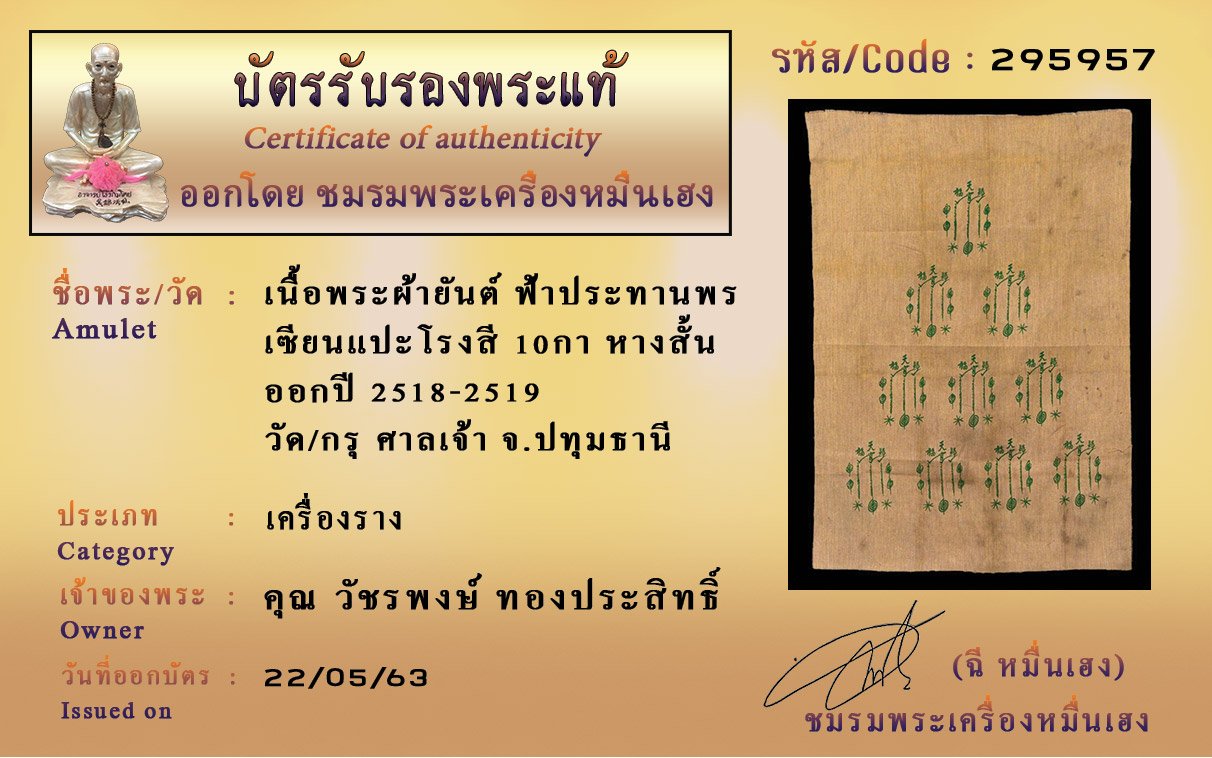 รหัสสินค้า : (295957) ผ้ายันต์ฟ้าประทานพร 10กา เซียนแปะโรงสี หางสั้น วัด/กรุ ศาลเจ้า จ.ปทุมธานี เนื้อพระ ผ้ายันต์ ออกปี2518-19