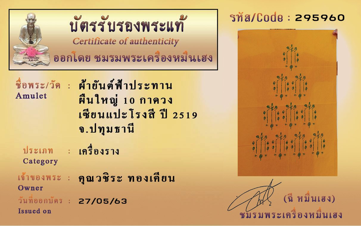 รหัสสินค้า : (295960) ผ้ายันต์ฟ้าประทาน 10กาดวง ผืนใหญ่ เซียนแปะโรงสี ปี2519 จ.ปทุมธานี