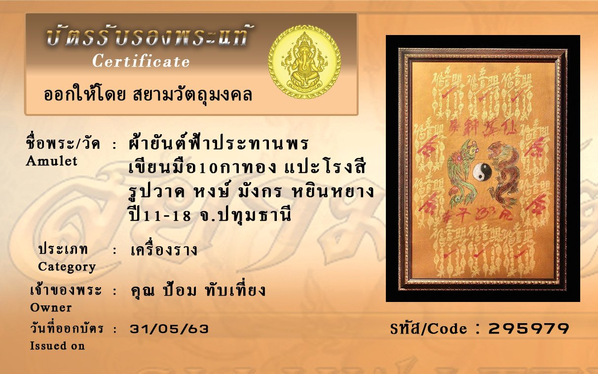 รหัสสินค้า : (295979) ผ้ายันต์ฟ้าประทานพร เขียนมือ10กา ทอง แปะโรงสี รูปวาด หงษ์ มังกร หยินหยาง ปี11-18 จังหวัดปทุมธานี