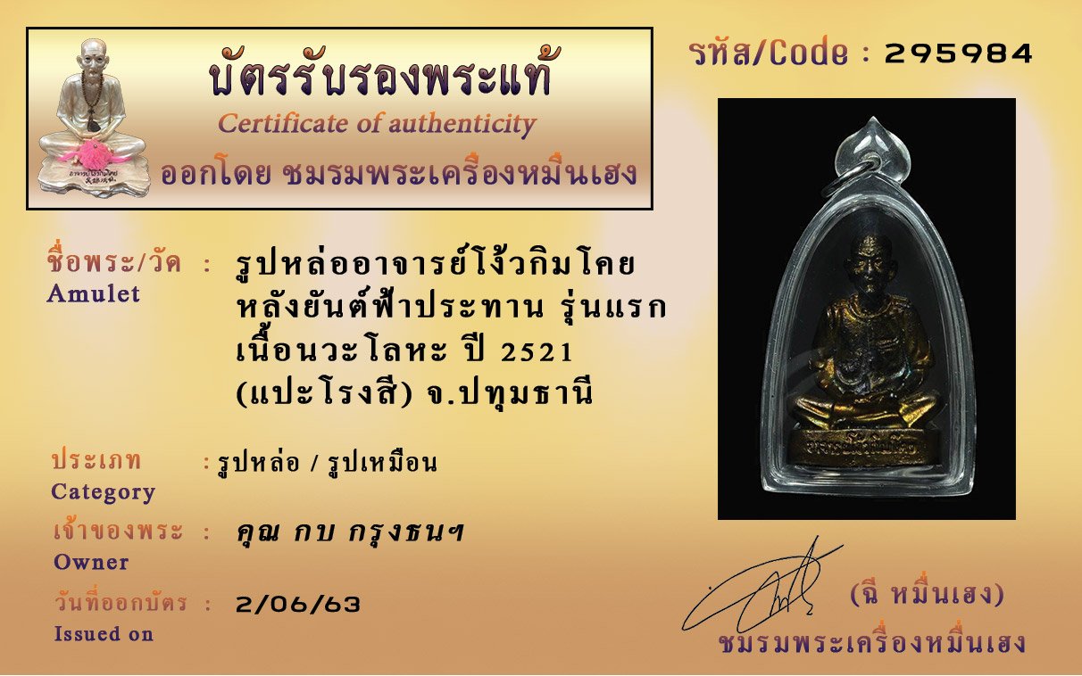 รหัสสินค้า : (295984) รูปหล่ออาจารย์โง้วกิมโคย (แปะโรงสี) หลังยันต์ฟ้าประทาน รุ่นแรก เนื้อนวะโลหะปี 2521 จังหวัดปทุมธานี