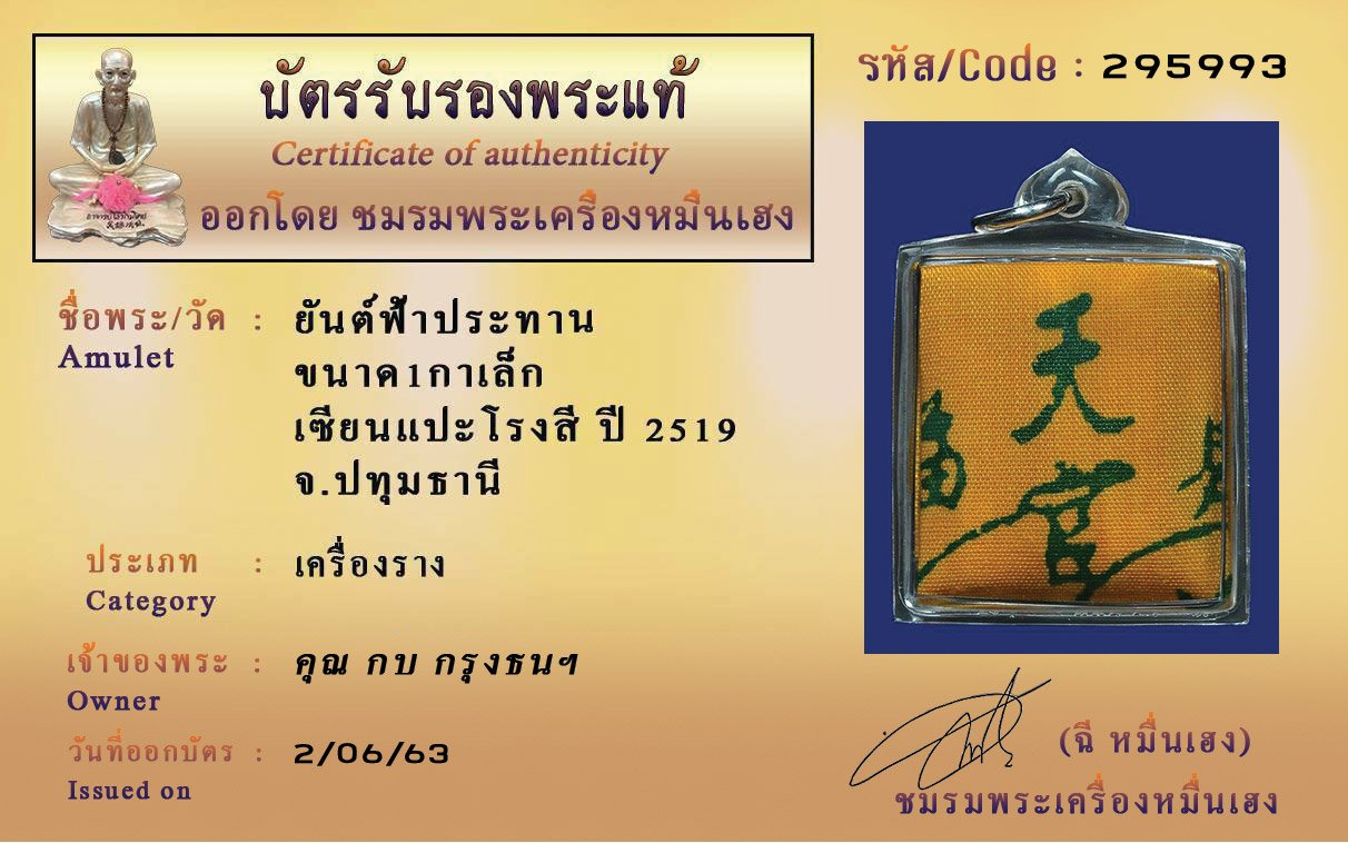 รหัสสินค้า : (295993) ยันต์ฟ้าประทาน ขนาด 1กาเล็ก เซียนแปะโรงสี ปี2519 จ.ปทุมธานี