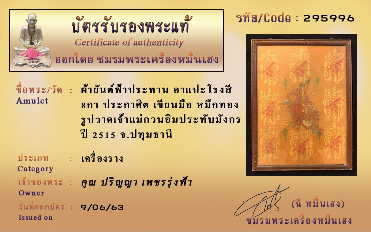 รหัสสินค้า : (295996) ผ้ายันต์ฟ้าประทาน เซียนแปะโรงสี 8กา ประกาศิต เซียนมือ หมึกทอง รูปวาดเจ้าแม่กวนอิมประทับมังกร ปี 2519 จ.ปทุมธานี