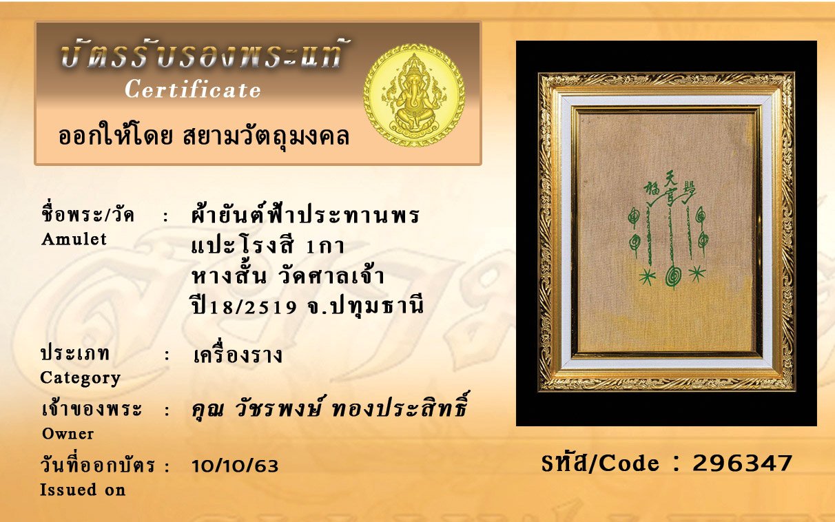 รหัสสินค้า : 296347 ผ้ายันต์ฟ้าประทานพร แปะโรงสี 1กา หางสั้น วัดศาลเจ้า ปี18/2519 จ.ปทุมธานี