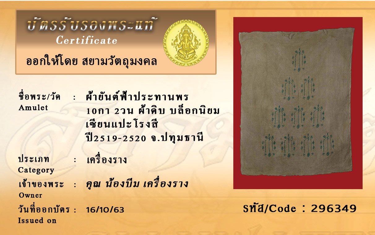 รหัสสินค้า : 296349 ผ้ายันต์ฟ้าประทานพร 10กา 2วน ผ้าดิบ บล็อกนิยม เซียนแปะโรงสี ปี2519-2520 จ.ปทุมธานี