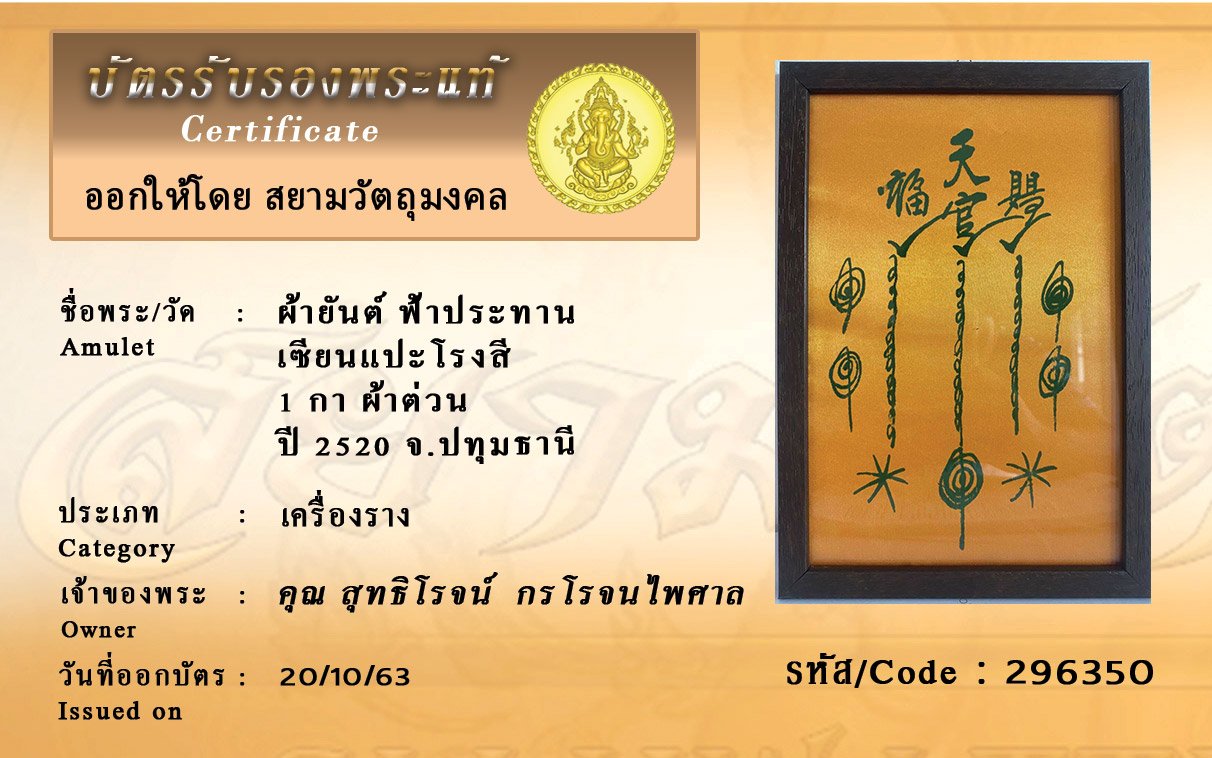รหัสสินค้า : 296350 ผ้ายันต์ ฟ้าประทาน เซียนแปะโรงสี 1 กา ผ้าต่วน ปี 2520 จ.ปทุมธานี