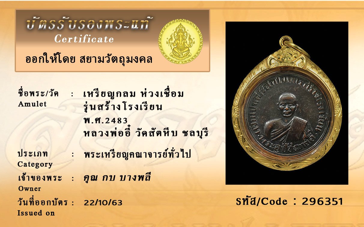 รหัสสินค้า : 296351 เหรียญกลม ห่วงเชื่อม รุ่นสร้างโรงเรียน พ.ศ.2483 หลวงพ่ออี๋ วัดสัตหีบ ชลบุรี