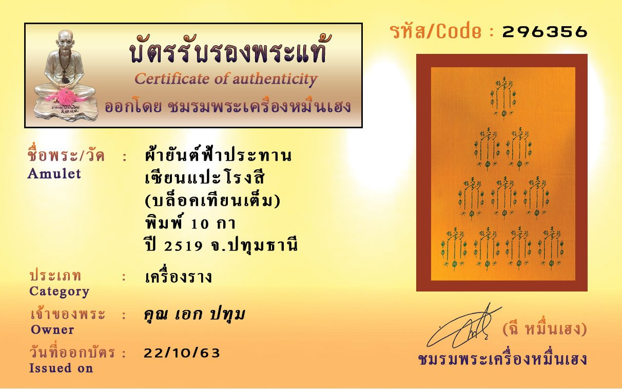 รหัสสินค้า : 296356 ผ้ายันต์ฟ้าประทาน เซียนแปะโรงสี (บล็อคเทียนเต็ม) พิมพ์ 10 กา ปี 2519 จ.ปทุมธานี