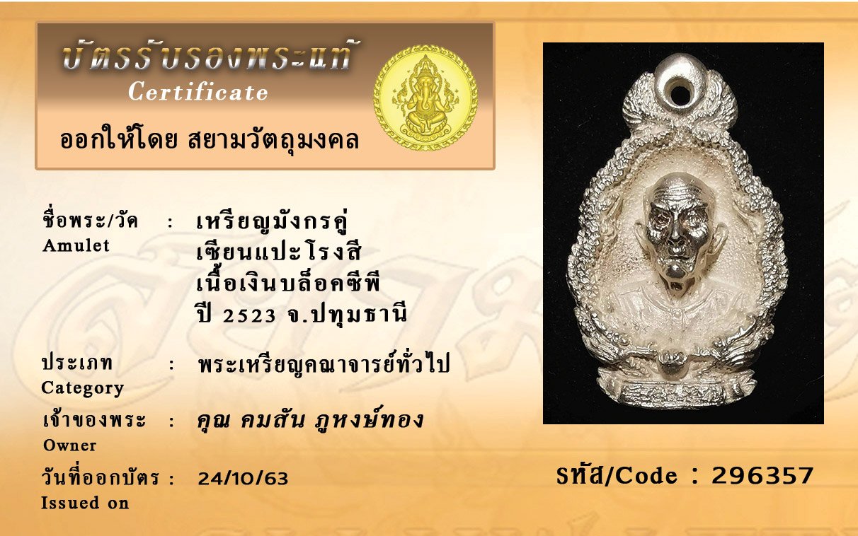 รหัสสินค้า : 296357 เหรียญมังกรคู่ เซียนแปะโรงสี เนื้อเงินบล็อคซีพี ปี 2523 จ.ปทุมธานี