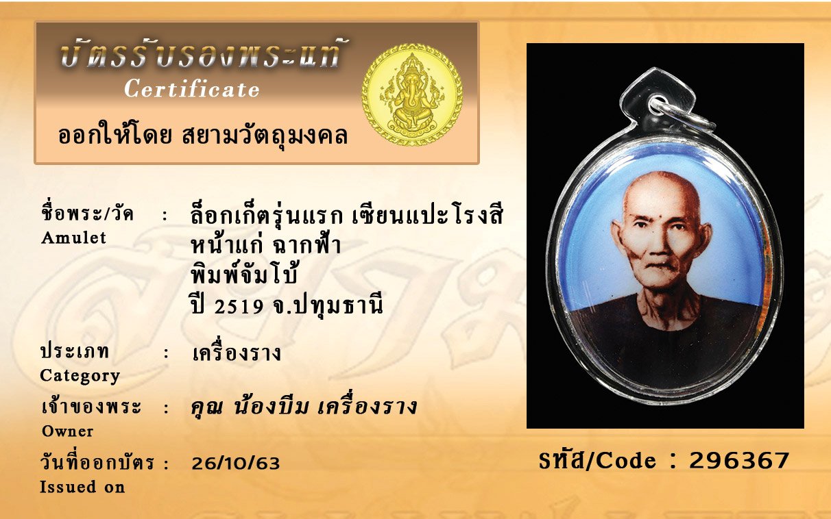 รหัสสินค้า : 296367 รูปเหมือน ท่านอาจารย์โง้วกิมโคย (เซียนแปะ โรงสี) เนื้อเรซิ่น หลังยันต์ฟ้าประทานพร ปี2523 จ.ปทุมธานี