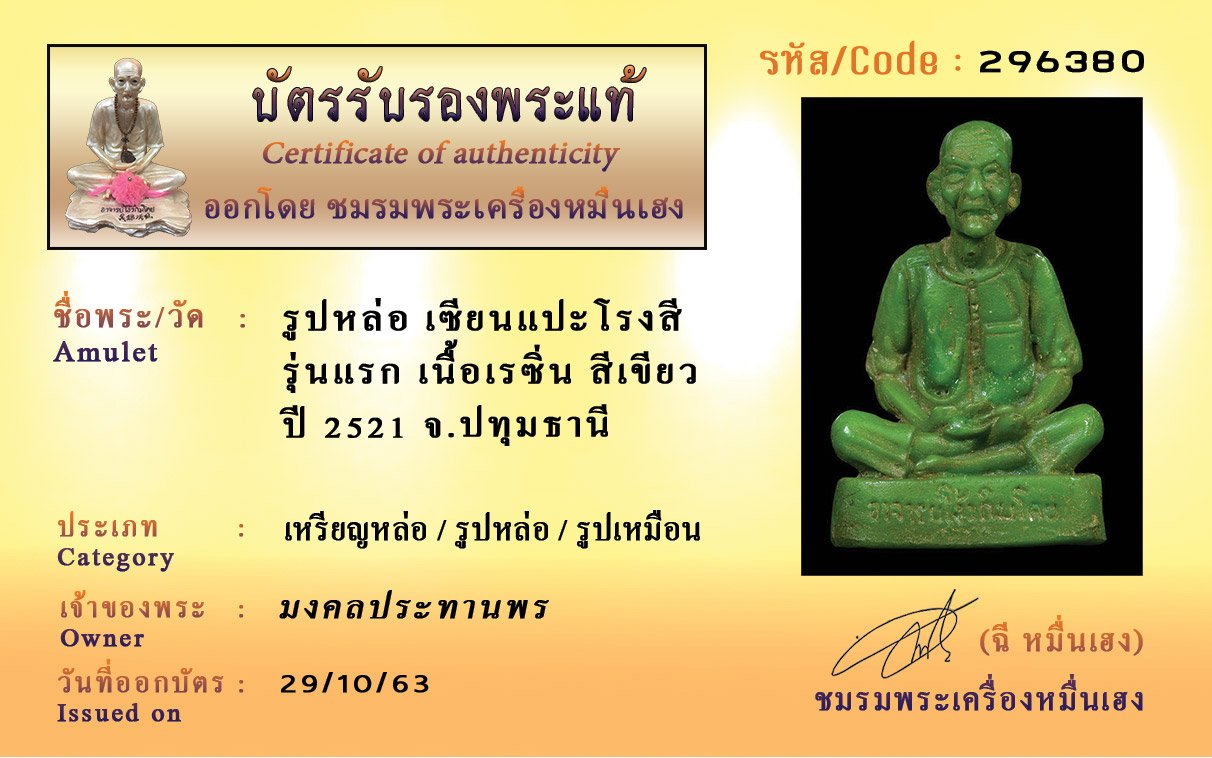รหัสสินค้า : 296380 รูปหล่อ เซียนแปะโรงสี รุ่นแรก เนื้อเรซิ่น สีเขียว ปี 2521 จ.ปทุมธานี